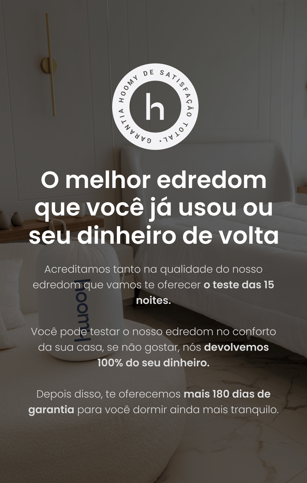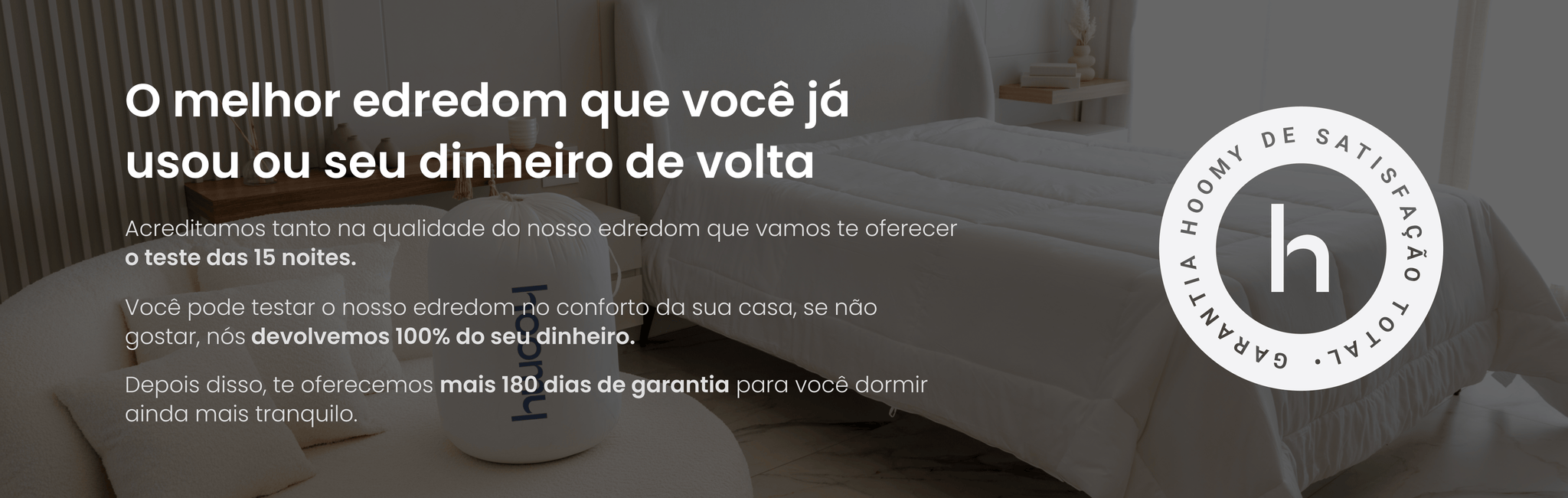 Você pode testar qualquer produto Hoomy no conforto da sua casa por 15 dias, se não for o que prometemos, devolvemos 100% do seu dinheiro!